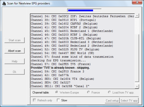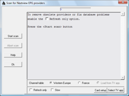 Si aucun fournisseur nexTView n'est trouvé, cela est probablement dû à une réception trop faible du signal. Cette méthode n'est en fait qu'une recherche sommaire, pour l'affiner, cochez l'option "Slow" et relancez une recherche en cliquant sur "Start scan".