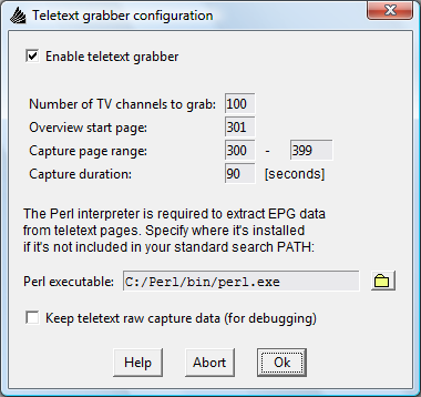 Les utilisateurs sous MS-Windows doivent télécharger et installer 'Perl' manuellement (cf activestate.com ou cygwin.com) et spécifier le chemin dans "Teletext grabber configuration" du menu "Configure". Alternativement vous pouvez étendre votre variable d'environnement de sorte que perl.exe soit automatiquement trouvé.