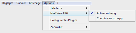 Après avoir installé nxtvepg il faut indiquer à K!TV quel est le répertoire d'installation et ensuite activer le lien entre K!TV et nxtvepg. Pour cela cliquez sur "Activer nxtvepg" dans "NexTView EPG" du menu "Options". Vous pouvez à tout moment modifier le répertoire d'installation de nxtvepg en sélectionnant "Chemin vers nxtvepg" dans ce même menu.