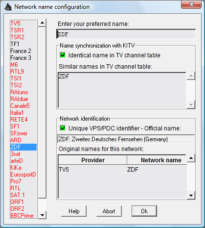 Allez dans le menu "Network names" du menu "Configure". Dans la colonne de droite se trouvent les chaînes dont les données nextview sont disponibles chez le(s) fournisseur(s) sélectionné(s). Celles pour lesquelles la correspondance n’est pas encore attribuée apparaissent en rouge. Sélectionnez la chaîne à attribuer dans la colonne de gauche et choisissez sa correspondante dans K!TV en cliquant sur le bouton devant "In K!TV". Répéter l'opération pour toutes les chaînes souhaitées et appuyer sur "Save" pour valider.