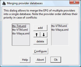 Si vous sélectionnez "Merge providers" à partir du menu "Configure", vous obtiendrez une boîte de dialogue contenant deux colonnes : celle de gauche contient une liste de toutes les bases de données actuellement disponibles. Celle de droite contient la liste des bases de données que vous voulez fusionner. Vous pouvez ajouter, effacer ou réorganiser à nouveau les entrées de cette liste. Après avoir fait avec votre sélection, appuyer sur "Ok" pour commencer la fusion et pour commuter le programme de lecture à la nouvelle base de données ainsi créée.
